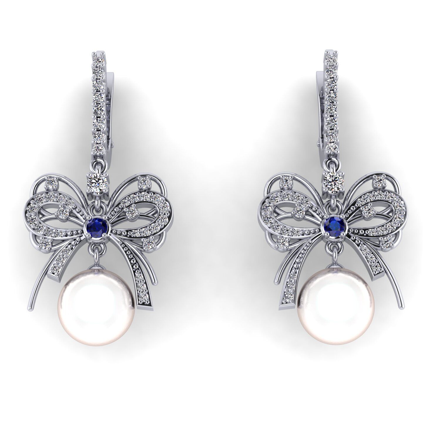 Cercei realizati in aur 18 K, 5.46 gr., cu diamante per un total de 0.38 Ct, F-G, VVS1, taietura brilliant, safire albastre, 0.30Ct, taietura brilliant si perle naturale AAA, culoare alba.
