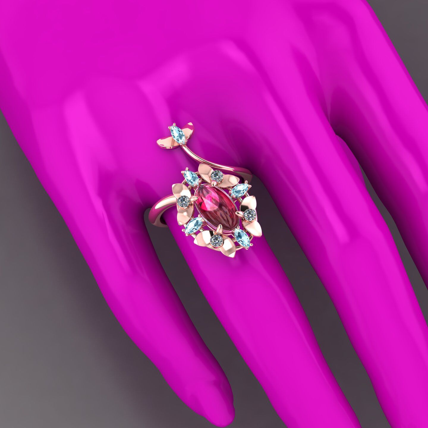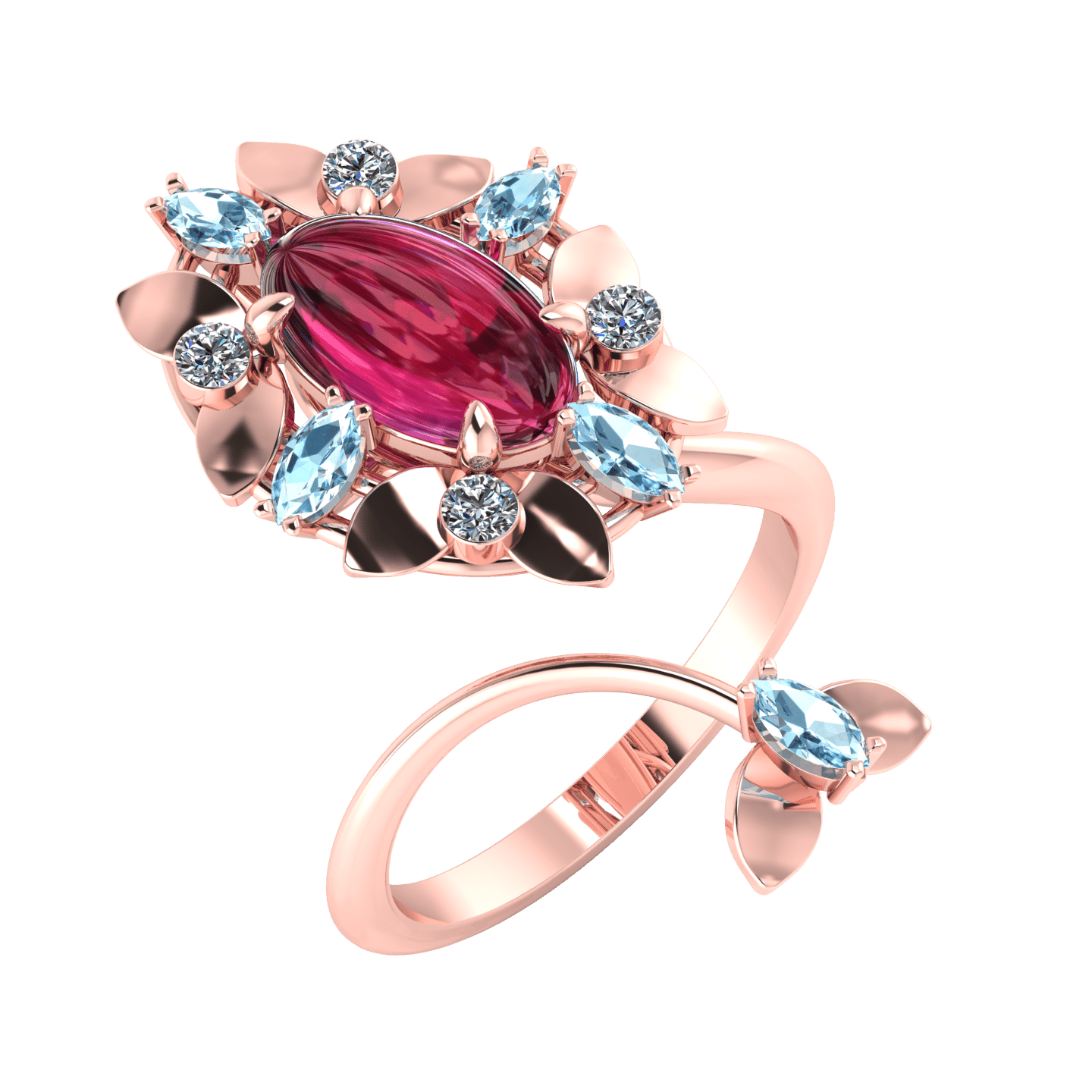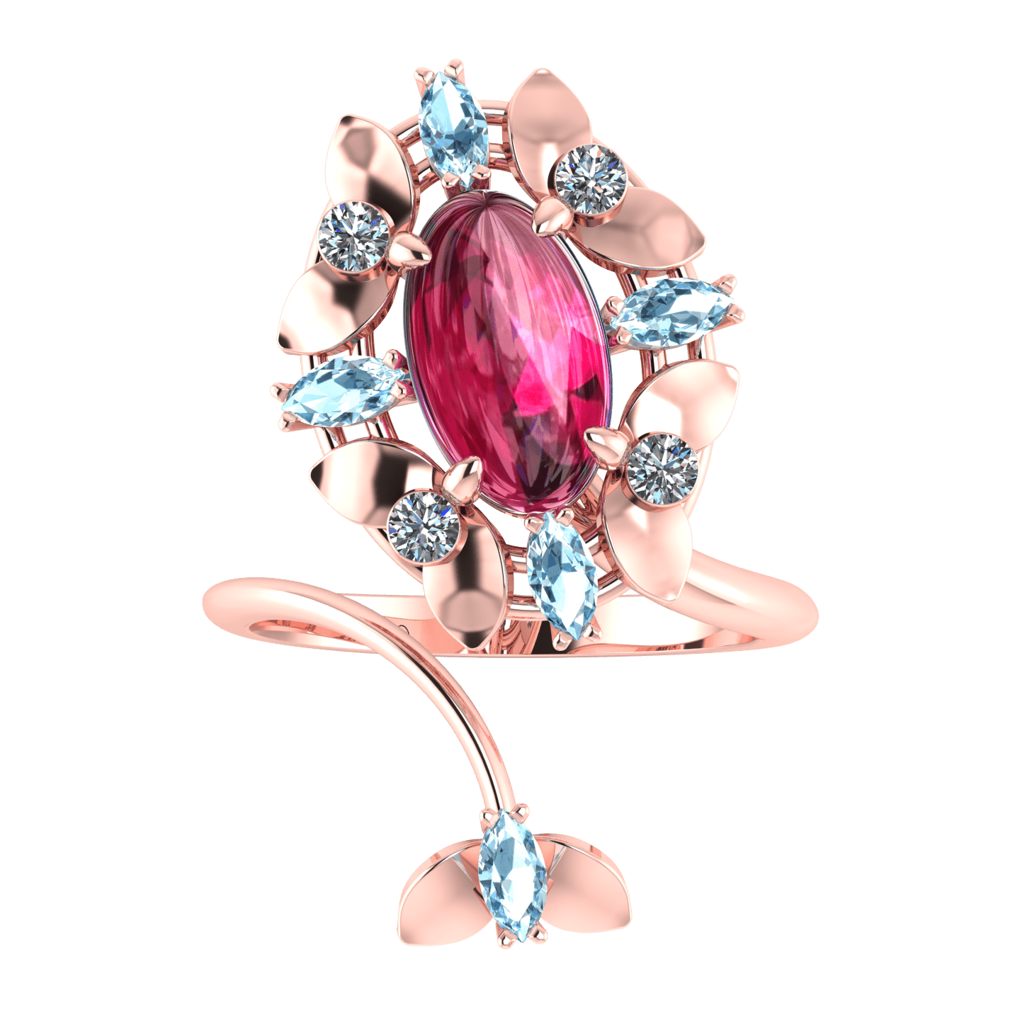 Piete pretioase diamante albe, taietura brilliant, culoare F-G, claritate VVS, per un total de 0.20 Ct, topaz albastru, taietura marquise, per un total de 0.30 Ct, piatra centrala tourmalina, taietura ovala, aproximativ 1.38 CT