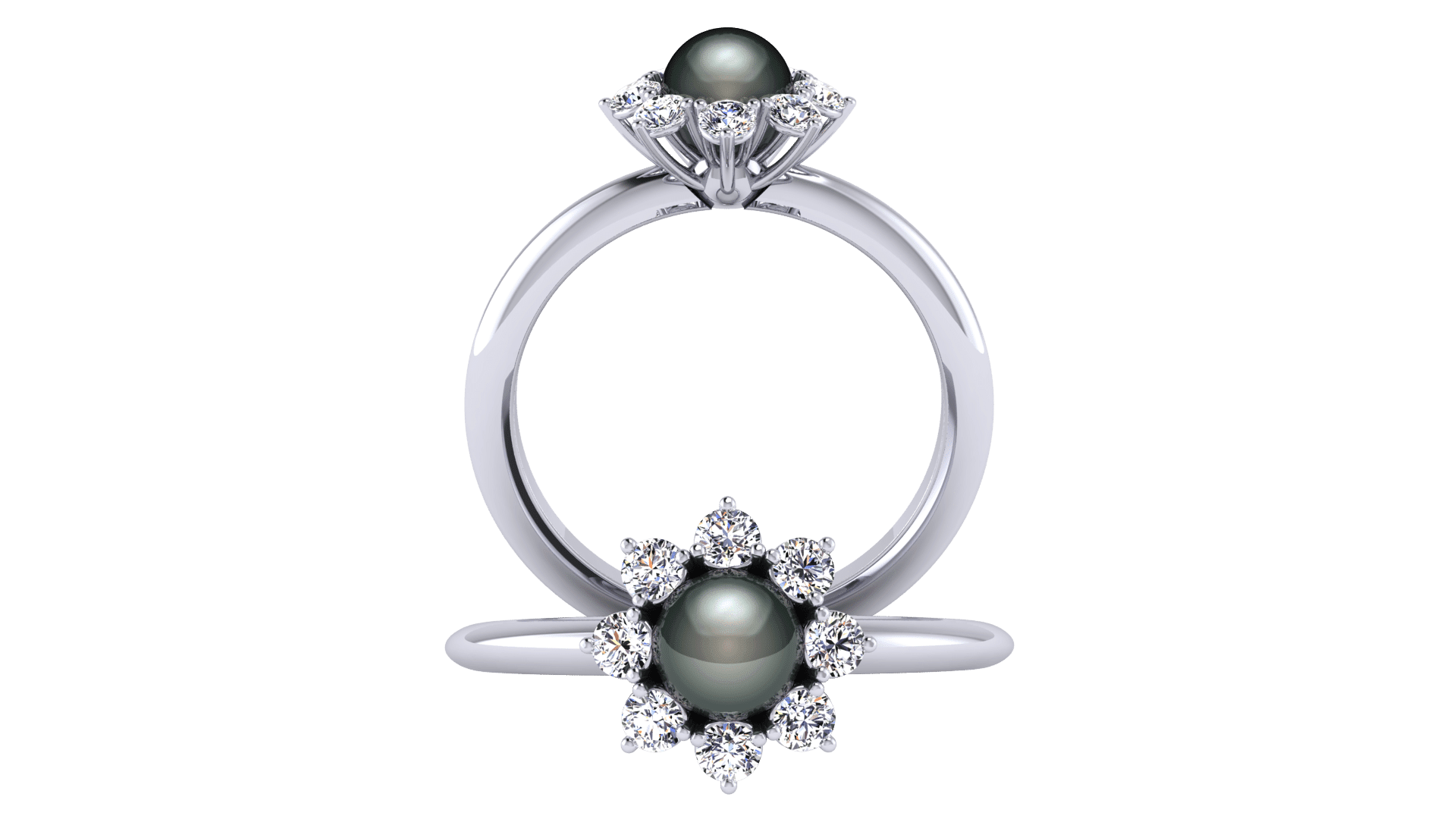 Inel din aur alb de 14K cu moissanite si perla neagra de Tahiti