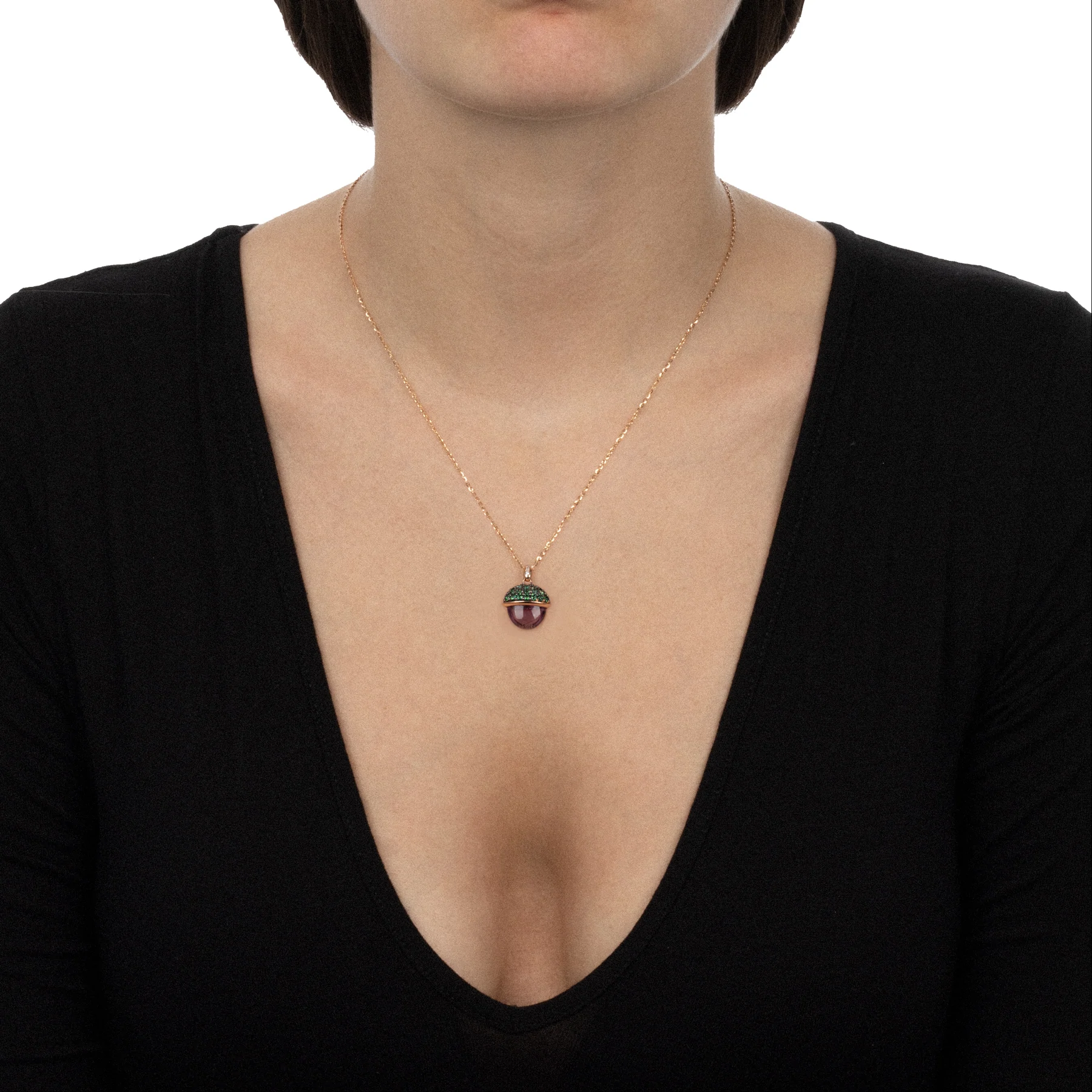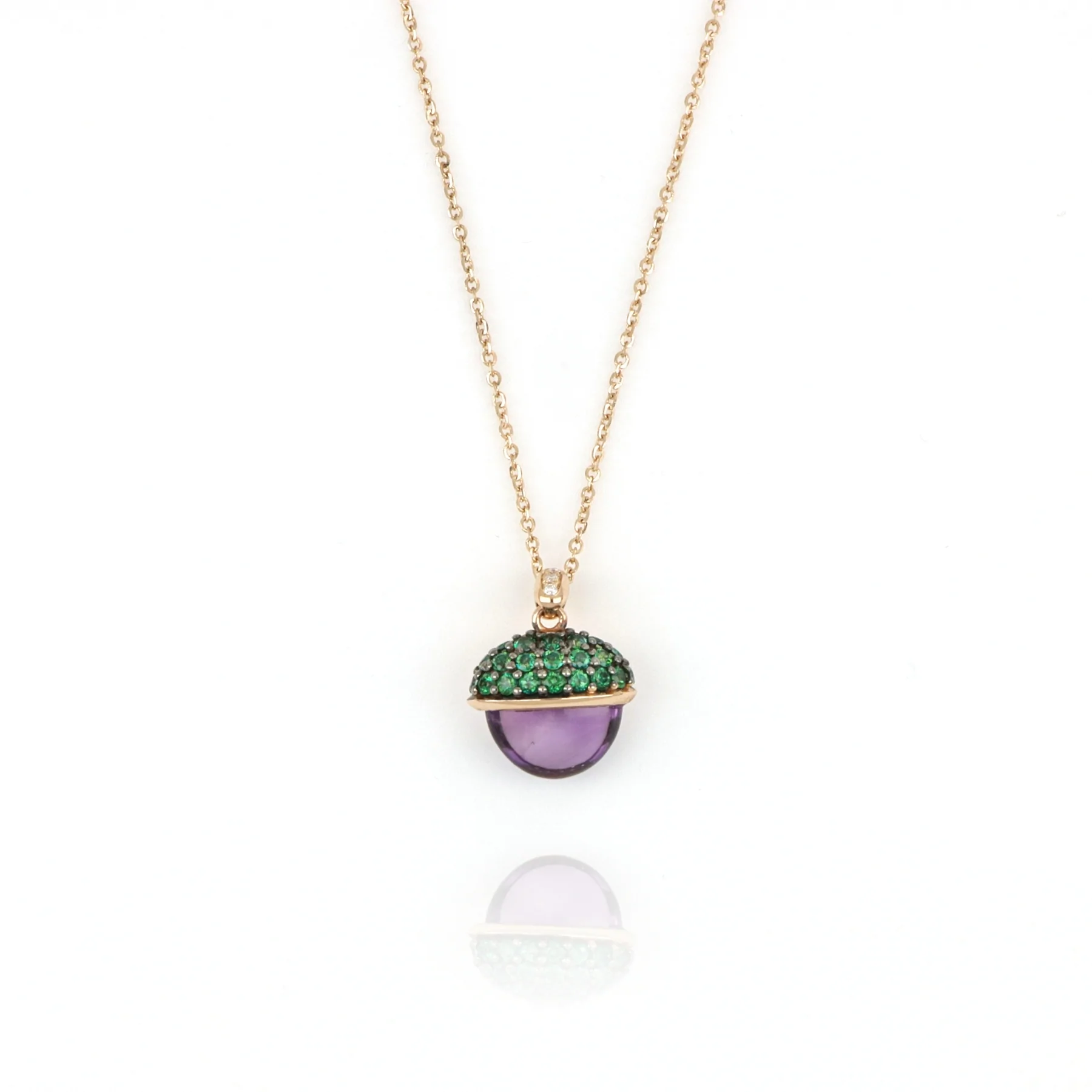 Pandantiv cu lantisor din aur galben de 18 kt, 5.30 gr., lungime 40 cm plus extensie 5 cm, cu ametist violet 3,10 ct și pavè de topaze verzi 0,60 ct.